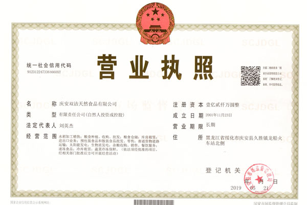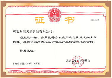 慶安雙潔天然食品有限公司認定為黑龍江省農(nóng)業(yè)產(chǎn)業(yè)化重點龍頭企業(yè)